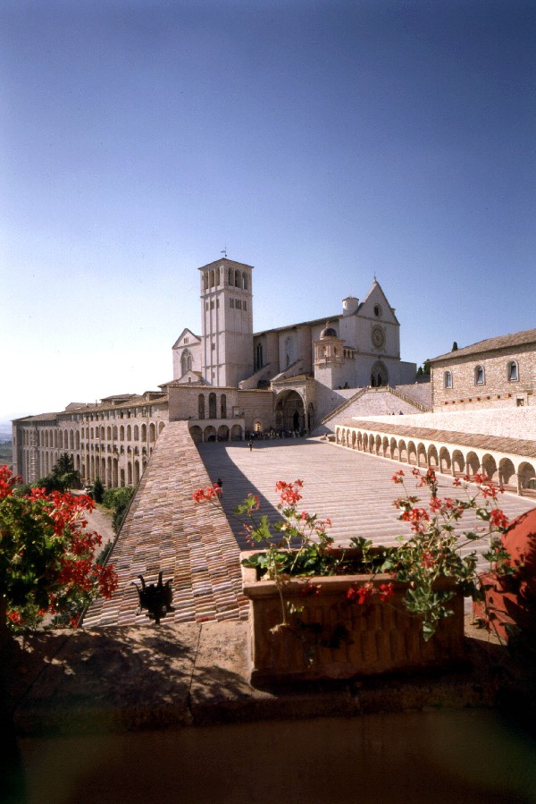La duplice Basilica di San Francesco, custodita dai Frati Minori Conventuali, ove è venerato e custodito nella Cripta con grande amore il corpo del Santo, venne ideata e in gran parte realizzata da Frate Elia, che ne diresse la costruzione ardita e imponente. Il monumentale complesso architettonico, posto allestremo lembo nord-occidentale della città, venne edificato a partire dal 17 luglio 1228, data del posizionamento della prima pietra da parte del pontefice Gregorio IX, allindomani della canonizzazione del Santo avvenuta in Assisi. Il corpo inferiore venne terminato nella primavera del 1230 e il 25 maggio dello stesso anno vi fu deposta la salma di Francesco. La basilica fu consacrata da Innocenzo IV nel 1253, anno in cui volgevano a conclusione anche i lavori del corpo superiore e del Gregorianum. Un tempio splendido voluto da Papa Gregorio IX, nei secoli si ingrandì e subì modifiche sino ad assumere lattuale forma. Alla fine del Duecento il tempio venne rafforzato con lelevazione delle torri laterali e, nella parte inferiore, furono ricavate alcune cappelle. Si tratta di una meravigliosa sintesi dellarte romanica e gotica. Nelle pareti delle due Basiliche i sommi artisti italiani hanno scritto con i loro pennelli quella "mirabil vita (di Francesco) che meglio in gloria del ciel si canterebbe" (Dante Alighieri). Per la decorazione delle pareti ci si avvalse dei più accreditati artisti del tempo: nei grandi cicli pittorici del secolo XIII e XIV, Giotto, Cimabue, Jacopo Torriti, Simone Martini, Pietro Lorenzetti hanno narrato la vita di Francesco e sintetizzato i misteri della vita di Cristo. I loro affreschi sono una vera e propria "Bibbia dei poveri" e fanno di questa roccaforte dello spirito un tempio unico e meraviglioso. Le ampie superfici delle pareti in tutte e due le chiese con i duemila metri quadrati di pittura murale sono state pensate per accogliere il poema pittorico biblico unitamente a quello del poverello e costituiscono il più armonioso concerto di colori di tutti i tempi. Una chiesa stupenda che grida nei secoli in versi architettonici e con colori vivacissimi il Magnificat di Francesco che "povero ed umile" è entrato ricco nel Regno dei Cieli. Alla Basilica Inferiore si accede tramite un arco quattrocentesco e un grande portale gotico finemente lavorato.