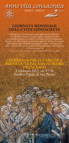 Logo [English, French, Italian, Spanish] Calendar [English, French, German, Italian, Portuguese, Spanish] Message of the Holy Father for the Opening of the Year of Consecrated Life (30 November 2014) [English, French, German, Italian, Portuguese, Spanish] To participants in the Plenary of the Congregation for Institutes of Consecrated Life and Societies of Apostolic Life (27 November 2014) [English, French, German, Italian, Portuguese, Spanish] Decree by which are established the works to be performed in order to obtain the gift of Indulgences on the occasion of the Year of Consecrated Life (23 November 2014) [English, French, Italian, Latin, Portuguese, Spanish] Apostolic Letter to all Consecrated people on the occasion of the Year of Consecrated Life (21 November 2014) [English, French, German, Italian, Polish, Portuguese, Spanish] Address of Pope Francis to participants in the Ecumenical Colloquium of Men and Women Religious, held by the Congregation for Institutes of Consecrated Life and Societies of Apostolic Life (24 January 2015) [English, French, German, Italian, Portuguese, Spanish] Holy Mass for the Day of Consecrated Life (2 February 2015): Homily of His Holiness Pope Francis (Video) [Arabic, English, French, German, Italian, Portuguese, Spanish] |